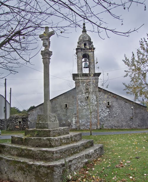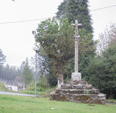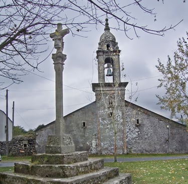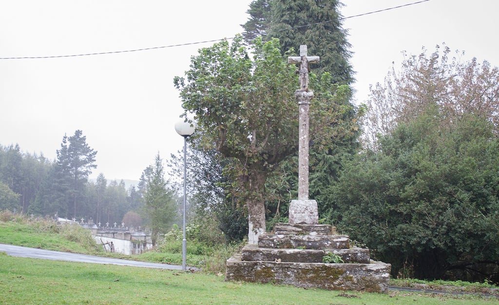 Frente al templo se alza un cruceiro-calvario de 1899, único en el municipio. En su base aparecen talladas las escenas de la Pasión de Cristo, mientras que el capitel luce cabezas de ángeles y las figuras del Crucificado y de la Virgen de la Piedad. Su minuciosa iconografía y la inscripción con el nombre del donante, José Bellas, evocan la devoción y el orgullo de una comunidad que encontraba en la piedra su redención espiritual.
